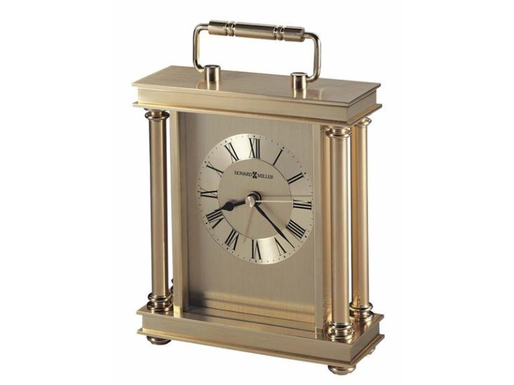 A brushed and polished brass finish gives this metal carriage alarm clock its enduring style. The decorative handle, turned brass-tone button feet, and polished brass-tone columns at the corners add to the clock's stately presence. Beneath a glass crystal, the brushed brass-tone dial features circular, diamond-cut numeral ring, black Roman numerals, black hour and minute hands, and brass second and alarm hands. Quartz, alarm movement includes 1 AA battery. Free engraving on all clock, please see artwork specs for artwork requirements. H. 7-1/2" (19cm) W. 5-1/4" (13 cm) D. 2" (5 cm)